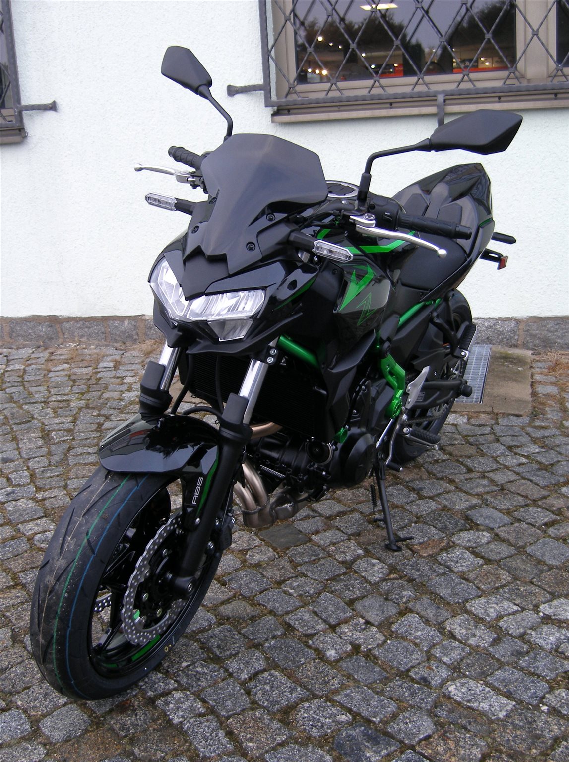 Diese Z650 wurde mit dem Sportpaket ausgestattet, dies beinhaltet die Soziusabdeckung in schwarz, das erhöhte Windschild, das Tankpad von Kawasaki, sowie die Display-Schutzfolie.